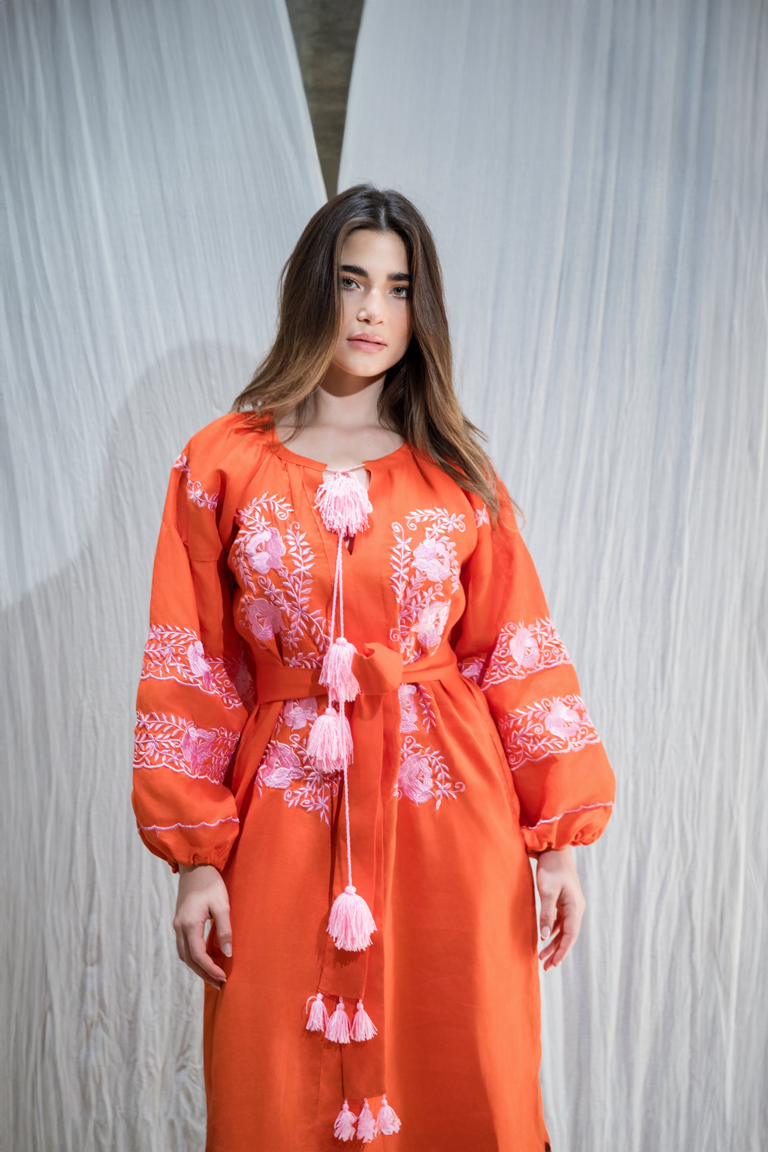 Vestido tipo túnica de lino naranja con bordados en hilo rosa, hecho por artesanas mexicanas.